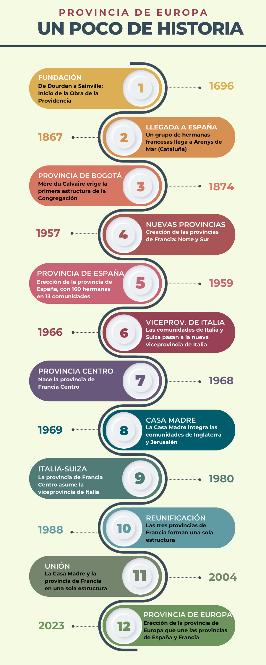 Es en este movimiento de solidaridad que las dos Provincias de España y Francia se mueven la una hacia la otra, para dar nacimiento a la Provincia de Europa. Sor Ángela Anta y Sor Véronique Margron, superioras provinciales en aquel momento, junto con sus consejos, fueron las primeras interlocutoras en estos intercambios que habían existido anteriormente, pero que ahora era necesario profundizar para poder dar los pasos necesarios hacia la unión. Así pues, se creó una comisión llamada "Théodore" (que debe su nombre a la primera hermana francesa misionera en España) para idear una forma de conocernos mutuamente. Al principio, fue a partir de vídeos cortos, en los que se hacía una presentación personal de cada hermana, así como una presentación de la misión realizada. Unos meses más tarde tuvo lugar el primer encuentro en Tours. Vivimos un momento muy fraternal de compartir y reflexión. Después llegó el momento de la asamblea capitular y de la creación de la nueva Provincia...