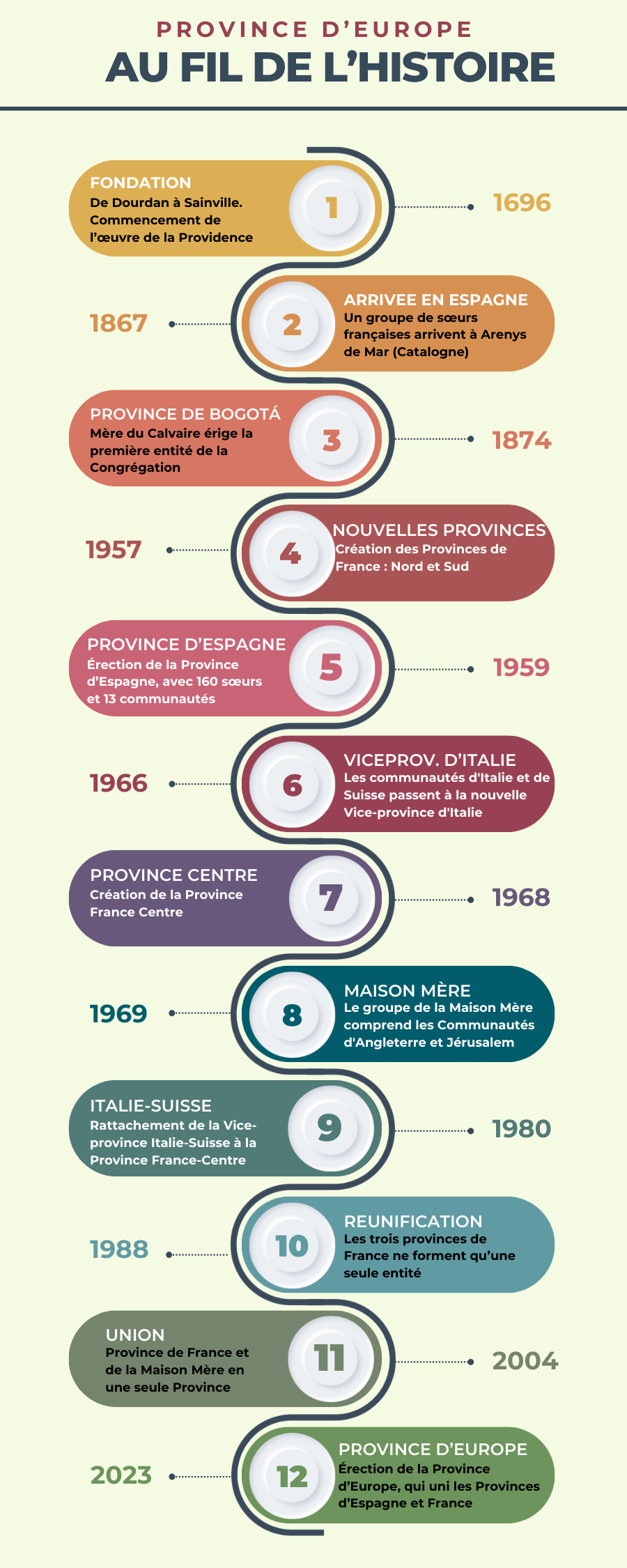 C’est dans ce mouvement de solidarité que les deux provinces d’Espagne et de France se tournent l’une vers l’autre pour faire naître la Province d’Europe. Sr. Angela Anta et Sr. Véronique Margron, prieures provinciales à ce moment-là avec leurs conseils sont les premières interlocutrices dans ces échanges qui existaient précédemment mais qu’il fallait désormais approfondir afin de pouvoir mettre en oeuvre les pas nécessaires en vue de notre union. Ainsi une commission, appelée « Théodore » (du nom de la première soeur française ayant oeuvré en Espagne) a vu le jour pour imaginer un chemin de connaissance. Dans un premier temps à partir de courtes vidéos, où une présentation personnelle de chacune a été faite, ainsi qu'une présentation de la mission en cours. Quelques mois plus tard avait lieu une première rencontre à Tours. Nous avons alors vécu un temps très fraternel de partage et de réflexion. Puis ce fut le temps du chapitre avec la création de la nouvelle Province.